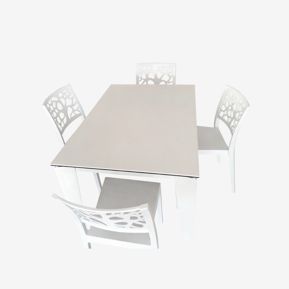 Tavolo 120 x 80 allungabile a 170 cm. Piano in vetro e gres bianco effetto pietra e gambe in metallo bianco. Ordinabile in altri colori.