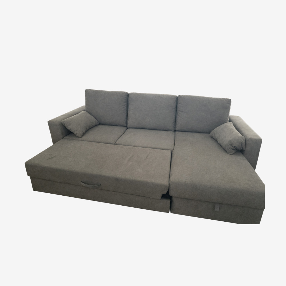 Divano 2 posti con penisola contenitore e panchetta estraibile dimensioni 230 x 160. Ottima manifattura in tessuto grigio scuro.